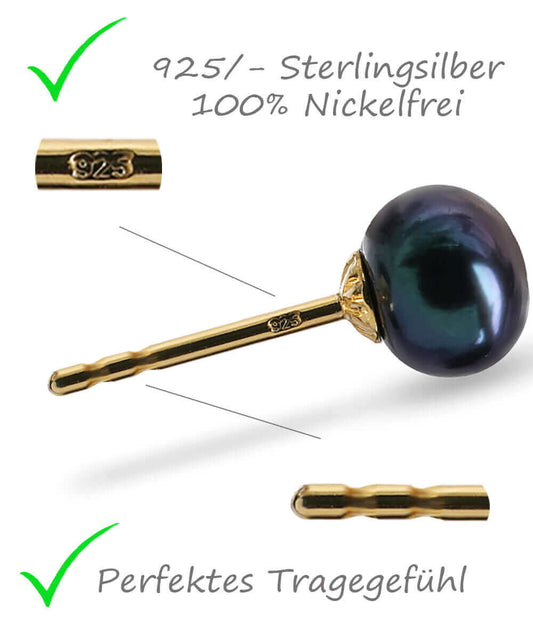 Ohrstecker mit echter schwarzer Süßwasser Perle 6mm Silber vergoldet