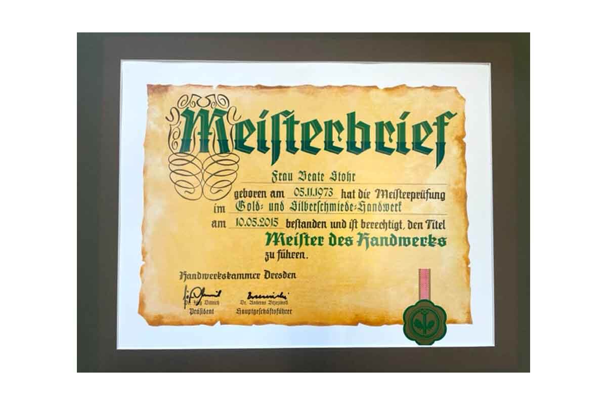 Wir sind stolz darauf, unsere fachliche Qualifikation durch den Meisterbrief zu unterstreichen, der unsere Kompetenz und Leidenschaft für das Goldschmiedehandwerk besiegelt.